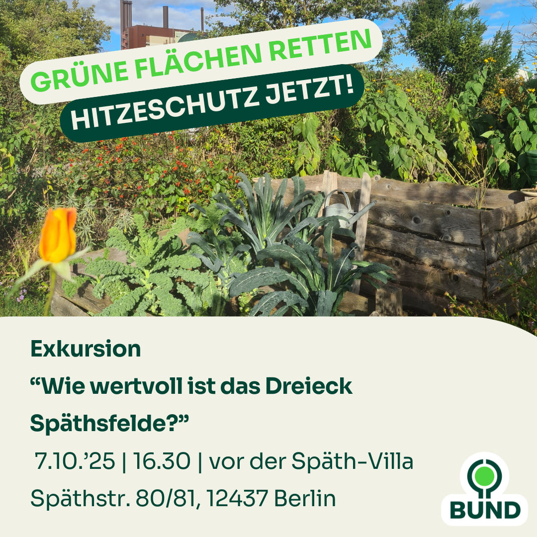 der BUND Berlin lädt am Dienstag, den 7. Oktober 2025, um 16:30 Uhr zu einer Exkursion ins Dreieck Späthsfelde ein. Hintergrund ist die geplante Bebauung dieser Kleingarten- und Naherholungsfläche, die viele von uns betrifft und bewegen dürfte.