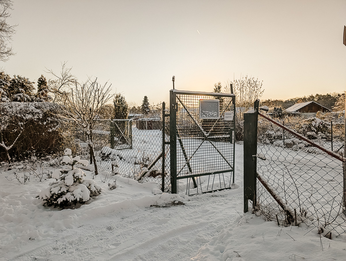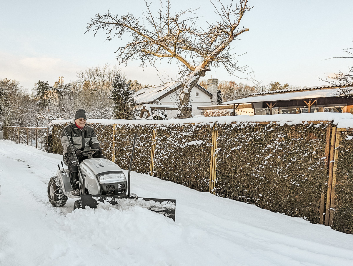 Anfang Januar 2026 hielt der Winter Einzug im Waldland – richtig, still und wunderschön. Über Nacht hatte sich eine geschlossene Schneedecke über unsere gesamte Anlage gelegt. Wege, Lauben, Hecken und Beete verschwanden unter einem weißen Tuch, das die Gärten sanft in den Winterschlaf versetzte.
